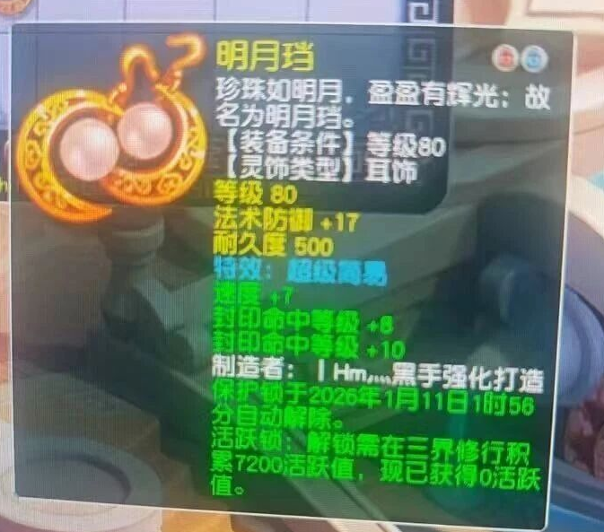 近期,一名玩家在鉴定80级灵饰时,竟获得极其罕见的“超级简易”特效。这个耳饰主属性为法防,额外附带双封印一速度,单从属性来看,正是为顶级精锐封系角色量身打造的极品。