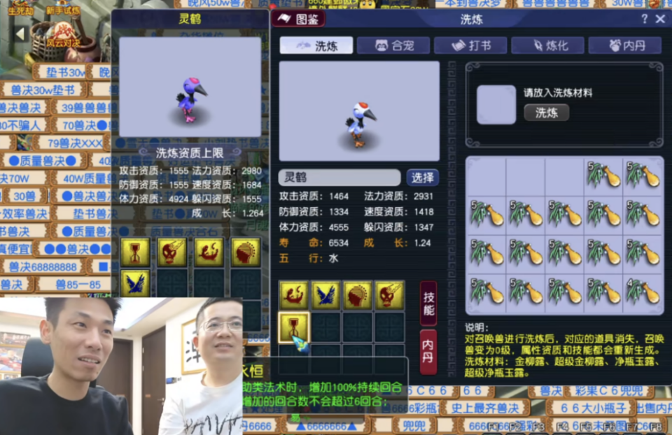 昨晚因鉴定资源不多,还未到十一点就已告罄。于是宝哥转而挑战起洗变异灵鹤的运气——没想到,好运这次来得格外痛快。仅仅三车下去,一只五技能变异灵鹤竟翩然而至。要知道,这类召唤兽市价接近三万,而宝哥前后只用了三千成本,这番手气,属实令人眼红!