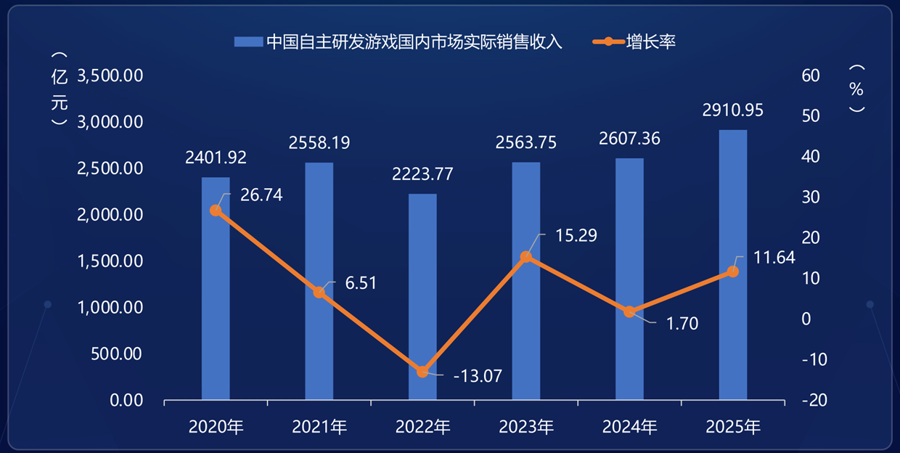 其中,创新力量成为增长的核心引擎。2025年自主研发游戏国内市场实际销售收入2910.95亿元,同比增长11.64%,既得益于头部长青产品的稳定支撑,更离不开多款自研新品的增量贡献。