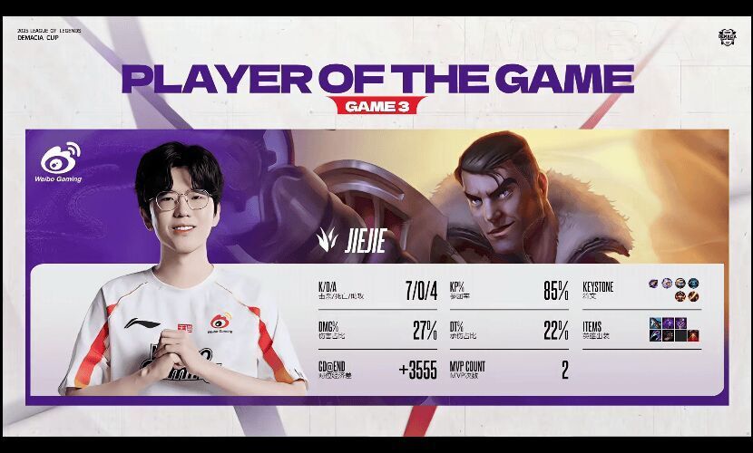 比赛打到中期,Jiejie开始发力,团战各种消耗收割,最终鏖战29分钟,WBG击败JDG赢下比赛,Jiejie连续两场砍下MVP,很难想象,这是今年被IG嫌弃的打野,京东除了辅助外,剩下四个人都被完爆了,JunJia杰斯2-0开局没有声音,HongQ沙皇2-0开局也在隐身,嘎子就更别说了。