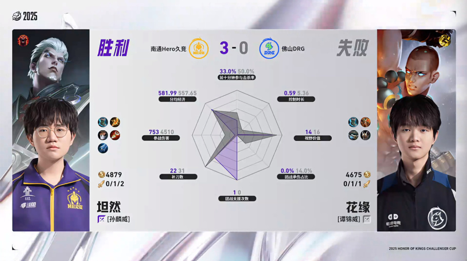 中期hero浪了几波,导致拖到了18分钟,但六神装的女娲就这样被坦然轻松贴脸了,似乎和其他人的女娲不太一样。梦岚虽然在龙坑点死妖刀,但自己的位置也很尴尬,被杨戬击杀,DRG双C全倒。橘右京被海诺追了一路,名刀触发还是跑不掉,Hero还是有惊无险拿下胜利。
