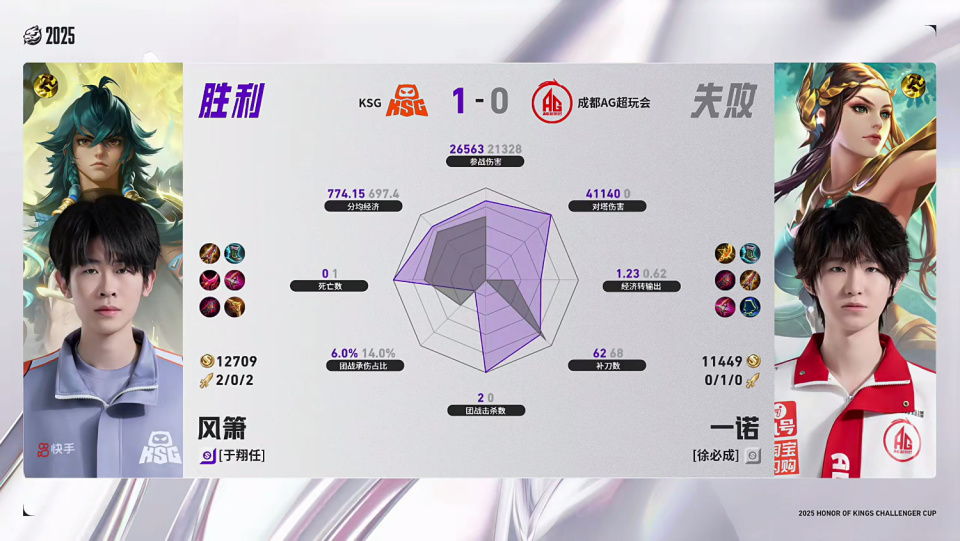 AG本来前期优势的双大的杨戬反而被进野区,自己的阵容又缺少控制,中期开始更难限制露娜的进场。14分钟露娜对位领先了杨戬4K的经济,最后一波上高优势,鲁大和王昭君的combo打掉了杨戬,KSG拿下比赛。