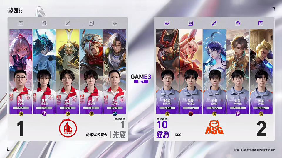 第一局,AG超玩会被KSG打了一个1-7。第二局,KSG在优势的情况下,没有抓住机会,被AG逆转!3分钟中路,KSG迅速支援击杀夏侯惇拿下一血,随后KSG继续进攻,不知火舞击杀对方射辅拿下二连击破,KSG顺势拿下首条小暴君。8分20秒,双方团战1换1,但KSG破掉对方中路一塔。
