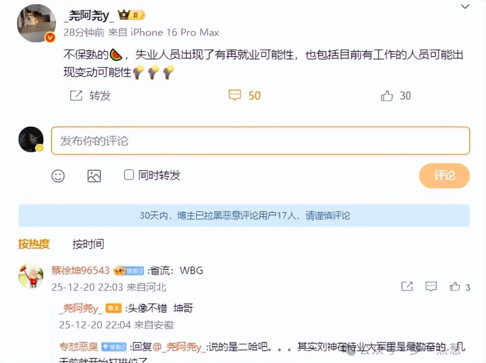 当然,WBG输掉比赛肯定不是一个人的问题,辅助的问题也比较大。二哈他的发挥更是一言难尽,甚至比其他队友的发挥还要糟糕。在这种情况下,有知情人就透露出了一个消息。这名知情人表示,有失业人员再就业的可能性。在评论区有粉丝猜测说的是不是二哈,这名知情人则对此进行了回应,基本就是默认。那么失业人员再就业说的也就是刘青松了,这一猜就猜到了。