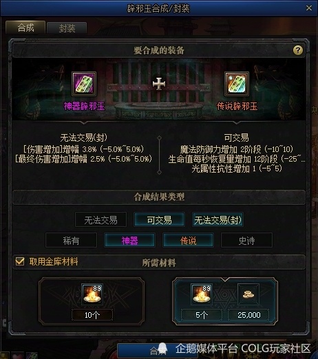 合成材料的两者品级之间的所有品级中随机生成。合成后的辟邪玉交易状态取决于两个