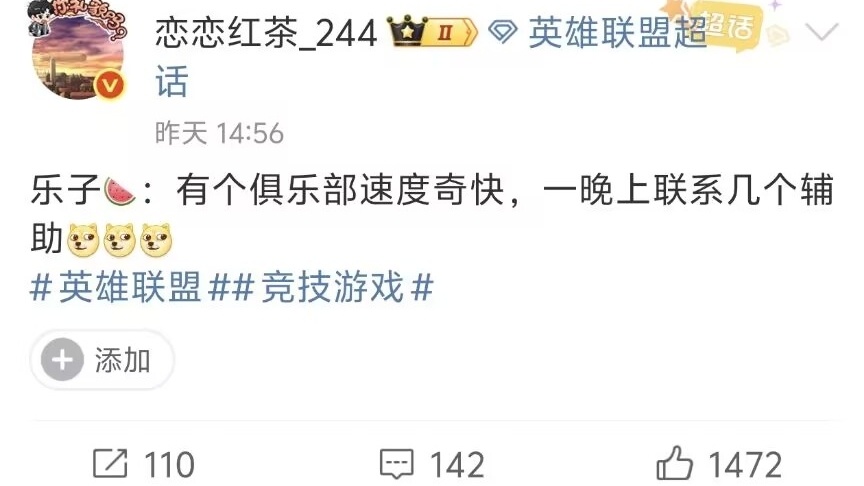 LPL德杯开赛之后,全一队首发的WBG,拿到了一胜一负的成绩,上一场比赛,微博爆冷翻车输给OMG,随后博主红茶就发文爆料:有家俱乐部,一晚上联系了几个辅助,虽然没有点名,但最近被吐槽最多的人,就是二哈,他连续两场BO3,状态都很低迷,很明显红茶说的就是WBG了。