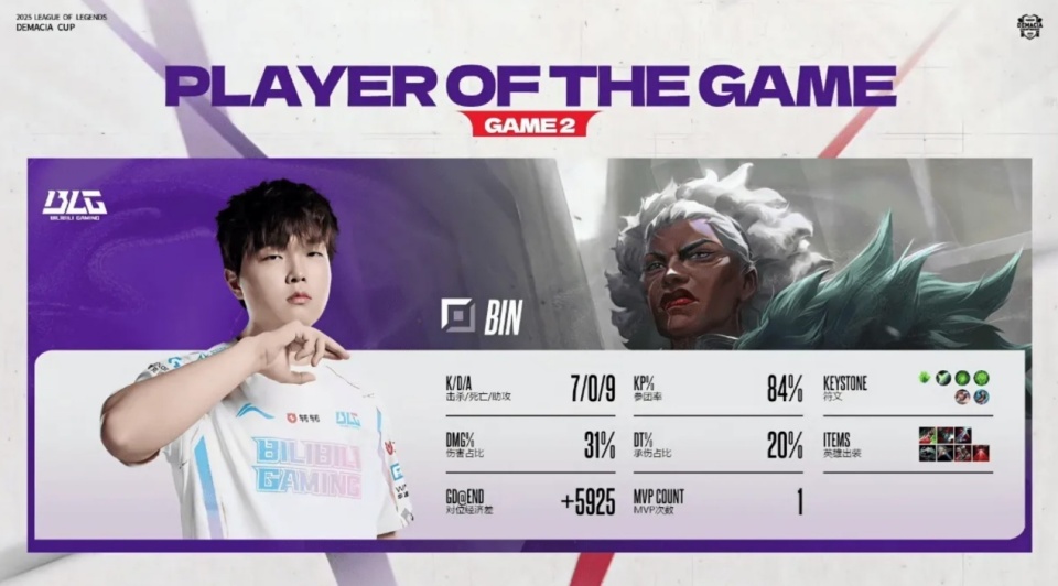 回到比赛,Bin的一手狼母在本局比赛打出封神操作,轻松游龙帮助队伍拿下双龙会,最后一波的高地推进战中更是一个人冲锋陷阵1V5全然不惧,配合队友打出双杀后一波结束比赛,两局比赛Bin的发挥都非常神勇。