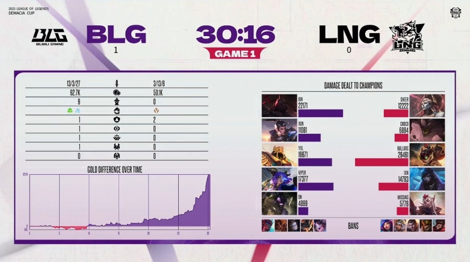 BLG战队本次德杯并没有派出全部主力,中路Knight选手缺席,但其他位置的四个主力选手全部登场,包括刚刚回归LPL赛区的韩援选手Viper,本轮面对的LNG战队,在昨天的比赛中击败了JDG战队。
