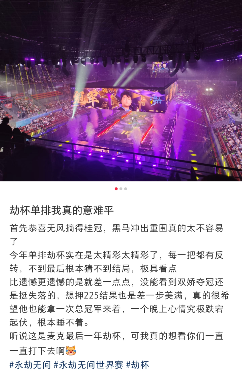 核心当然是比赛。劫杯总决赛在春茧体育馆连打两天。葡萄君全程参与,坐了13个小时。现场不仅请来了希林娜依·高和胡彦斌热场献唱,还有12位单排选手和12支三排队伍高强度厮杀,单排冠军“无风”黑马夺冠后泪洒当场。