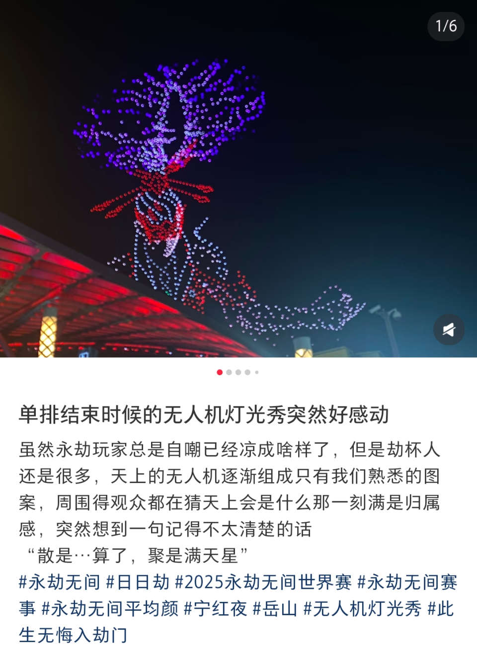 我还记得周六晚上,单排冠军“无风”黑马夺冠后泪洒当场,全场观众起立鼓掌。而走出场馆后,前面不少人突然停下了脚步,望向天空。我下意识回过头,发现“春茧”红色的屋顶上方,无人机编队正以《永劫无间》的图像点亮夜空。大家不约而同地举起手机,似乎都想把这一夜,连同那漫天红光一起,定格在相册里。