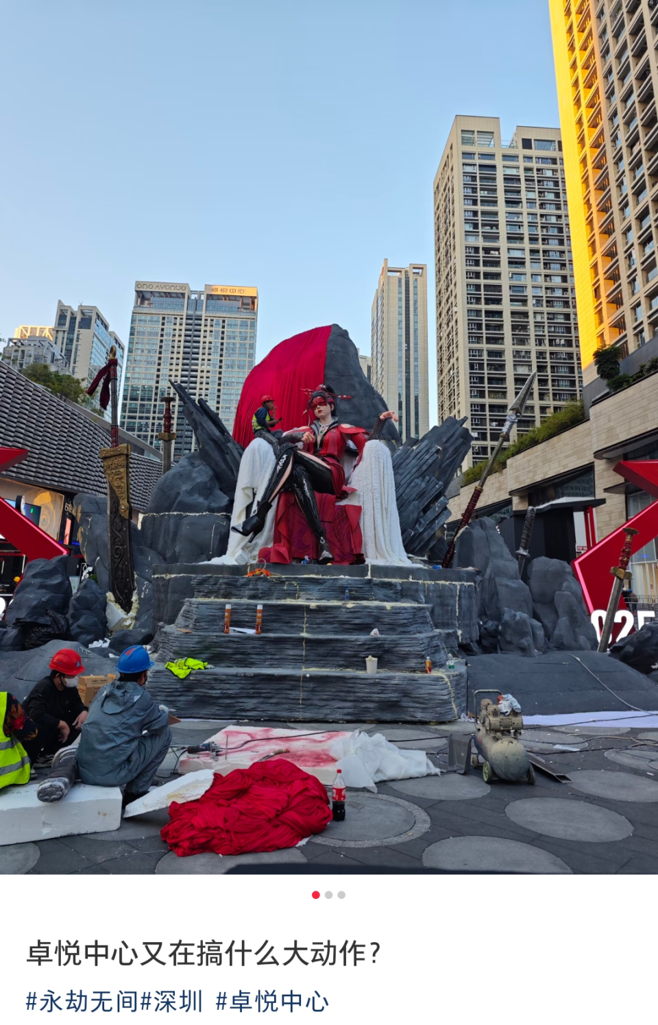想打卡?《永劫无间》直接包下了卓悦中心的露天广场,邀请全体粉丝参与“劫日派对”嘉年华。场地正中间,提前几天竖起来的超大宁红夜雕像,一度让路过的市民都在打听这到底是要办什么大活动;