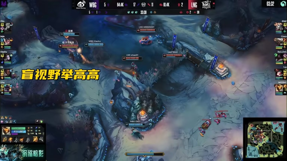 全一队首发的WBG,被LNG暴打,是真有点抽象,第二把打到29分钟,微博经济一度领先5K,结果最关键的一波团,ELK滑脸被开,Erha盾举错方向,导致WBG后续团战逐步溃败,LNG打野也确实勇,狼母有大就放,很敢尝试,决胜团盲视野,举到草丛里的小虎,一波就完成了翻盘。