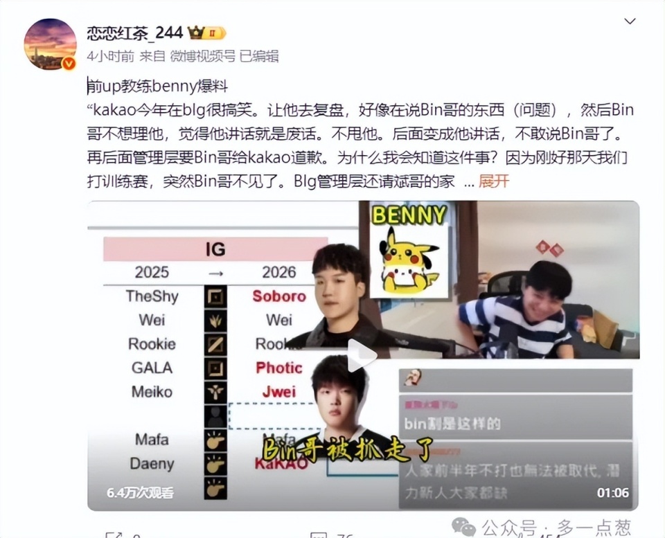 Kakao教练在复盘比赛的时候指出Bin在团战和细节操作上有问题,Bin觉得他说的是废话,并不想理他。于是到了后面Kakao教练已经不敢说Bin了,最后就是Bin被管理层要求道歉。恰好那天BLG正在打训练赛,Bin突然不见,换成了二队来打上单,后面才得知是Bin的家人跑到俱乐部让Bin给Kakao教练道歉。