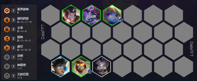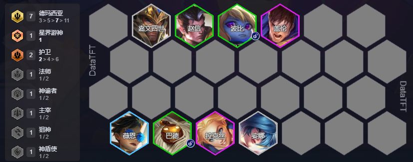 这套阵容就直接使用德玛西亚过渡即可,野怪回合掉装备可以直接尝试合1.5件装解锁波比,优先避免消耗反曲弓和斗篷就行;2-3D4下留德玛的牌顺便解锁巴德