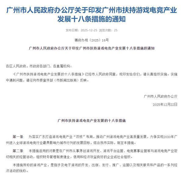 中国网财经12月25日讯 广州市人民政府发布《广州市扶持游戏电竞产业发展的十八条措施》(简称《措施》),其中提到,支持电竞赛事举办。扶持电竞赛事联盟和电竞俱乐部。对电竞赛事联盟按照年度赛事总投入给予每个赛事联盟最高不超过200万元的事后一次性补助。