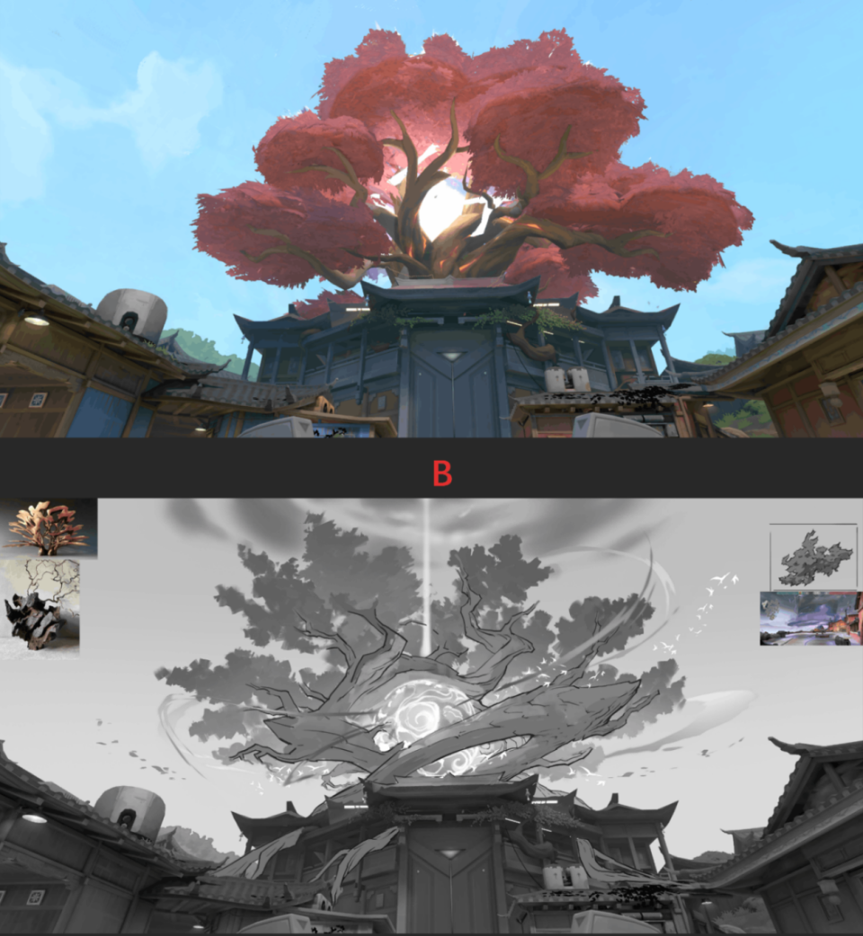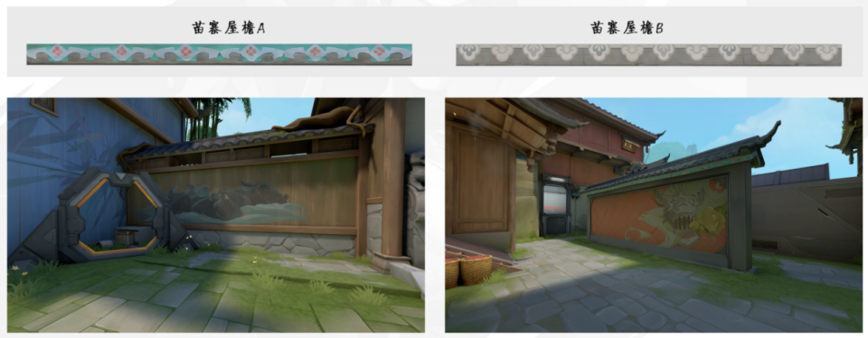 为了保持色调的一致性,不让地图元素干扰正常的游戏进程,设计师组还对取材地的屋檐样式进行了化用,舍弃看起来有些突兀的白色,选用和地图整体风格契合度较高的绿色。