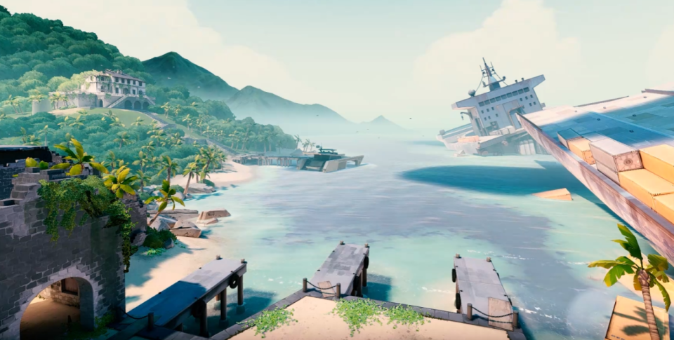 除了角色设计之外,游戏中的地图同样花费了设计师许多心血。我们上面提到,为了竞技性考虑,瓦手地图的主体部分必须保持简洁。而那些地图不可互动的部分,就是设计师展示业务能力的时候了。微风岛屿里阳光穿过棕榈叶的海岛风光、亚海悬城里整座城市漂浮在空中的视觉奇景、霓虹町高低错落的城市设计,都在游戏里恰如其分地呈现了出来。