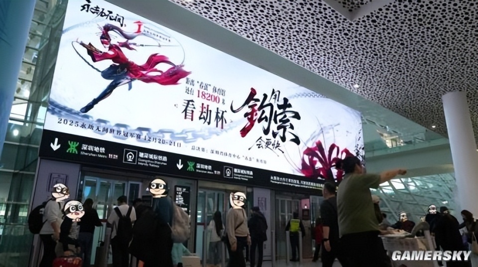 距离赛场最近的地铁出口处,贴满了《永劫无间》与本次赛事的宣传画面。在白色瓷砖的映衬下,一条长达数十米的红色巨幅海报格外醒目,吸引不少路人驻足观望;而临近扶梯出口处,与本次冠军总决赛“为‘振’而战”的宣传标语,又再次铺满整个地铁通道。