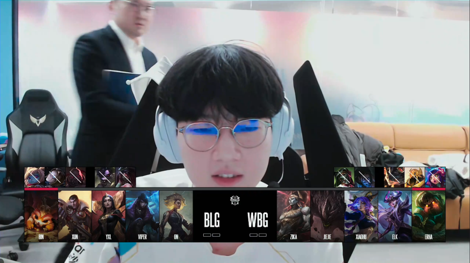 第一局比赛,BLG蓝色方,禁用:波比;发条;塞恩;牛头;阿卡丽,选用:Bin纳尔;Xun杰斯;Yxl妖姬;Viper厄斐琉斯;ON芮尔;WBG红色方,禁用:妮蔻;沙皇;兰博;塞拉斯;烈娜塔,选用:Zika亚恒;Jiejie石头人;Xiaohu辛德拉;Elk芸阿娜;Erha泰坦