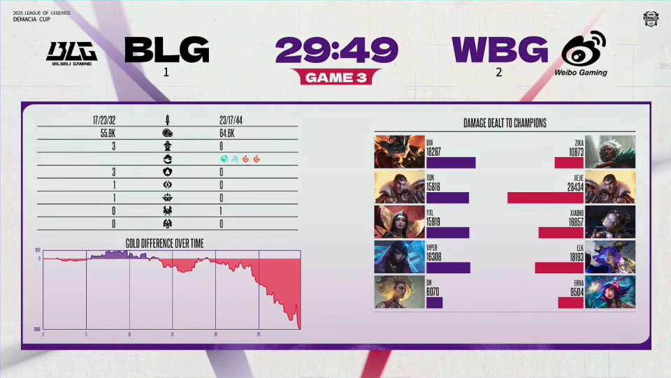 结果第三局比赛,WBG延续状态,碾压局BLG胜利。5分钟左右,Xun杰斯一炮击杀Xiaohu;7分钟左右,双方杰斯完成互换,随后Bin精准伤害计算单杀Zika;8分钟左右,WBG下路越塔Elk拿下双杀,随后BLG上路越塔击杀Zika;10分钟左右,BLG上路四包二击杀Zika与Xiaohu,随后Yxl失误W被塔击杀;15分钟左右,Jiejie一炮打残Viper,Elk芸阿娜精准寂灭掌收下Viper人头;22分钟左右,Yxl妖姬抓住机会切死Xiaohu,随后Erha激进向前被击杀;24分钟左右,Erha妮蔻出色开团配合Xiaohu打出巨量AOE,WBG团战大获全胜;26分钟左右,WBG中路轻松击杀BLG野辅,随后利用人数优势拿下火龙魂;最终29分49秒,WBG团灭BLG,让一追二,ELK暴打老东家。