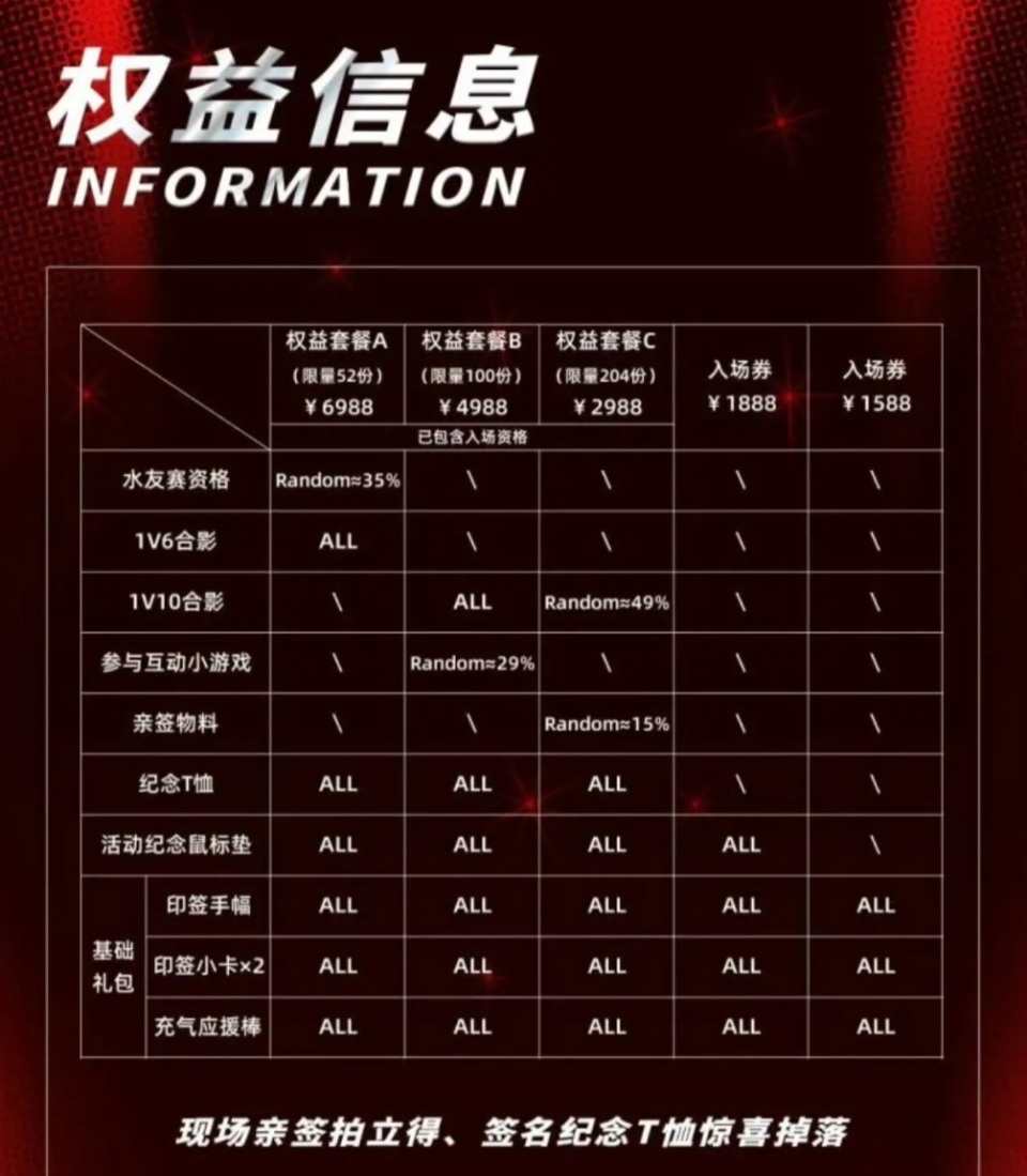 还有就是粉丝见面会这类的活动,不知道是不是第一次,如果有其他的选手个人向的见面会活动,还可以对照对比一下价格,如果没有的话,那就很难去判断这个价格到底合不合理了。