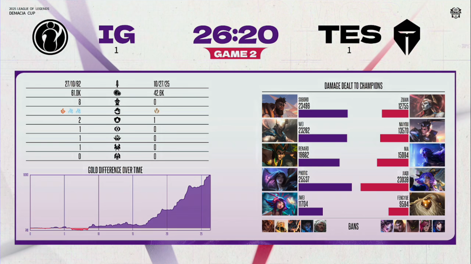 结果第二局比赛,双方在前15分组打得比较胶着,经济无法拉开。直到17分钟左右,TES劣势位置接团,IG众人战斗力拉满完成2换4;21分钟左右,IG击杀TES四人并轻松拿下厄塔汗;23分钟左右,巨大经济优势接连碰撞,IG团战直接平推打出团灭;最终26分20秒,IG团灭TES,扳回一局!