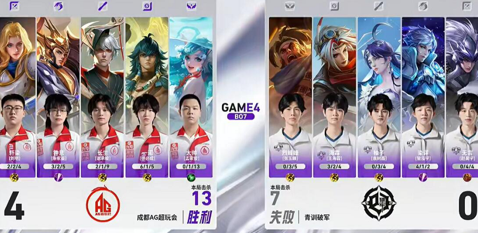 之后AG完全找回了状态,真的是越战越勇,BP也是越看越顺眼,反正没有蔡文姬,一切都好说,最终的结果,AG不仅赢了,而且直接零封了青训破军,一下子青训破军就被打回了原形,甚至最后一把,青训破军都选择换人了,还是直接换了2个人,很大胆。即使拿出本命诸葛亮,依旧输了。