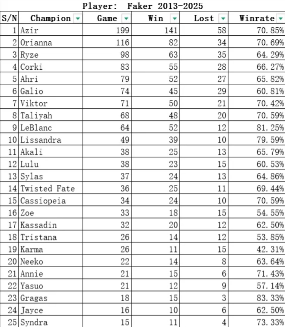 Faker生涯数据公开,第一招牌沙皇,胜率高达71%,英雄池深不可测