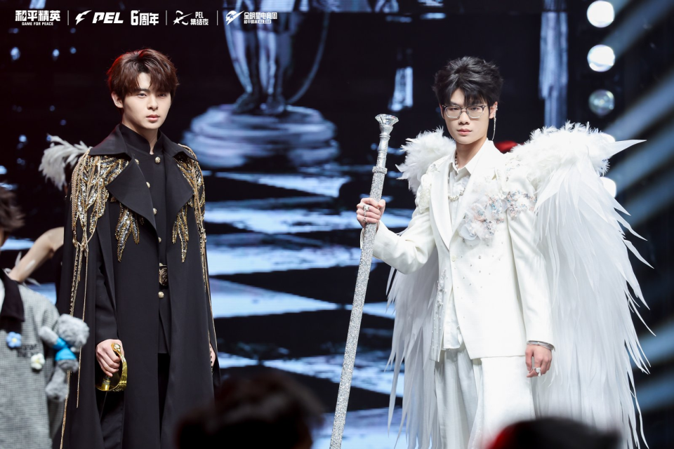 当“PEL第一人”北京JDG.Paraboy 伞兵身着黑金披风,以 “傀儡师” 的神秘造型在伴舞簇拥下抬轿登场,抬头间气场全开,瞬间为这场魔法盛宴拉开暗黑序章;而“PEL人气王”湖南TEC.33Svan, 则在漫天飘落的羽毛中身着白翼华服降临,手持权杖的造型宛如天使下凡,成为全场视觉焦点。
