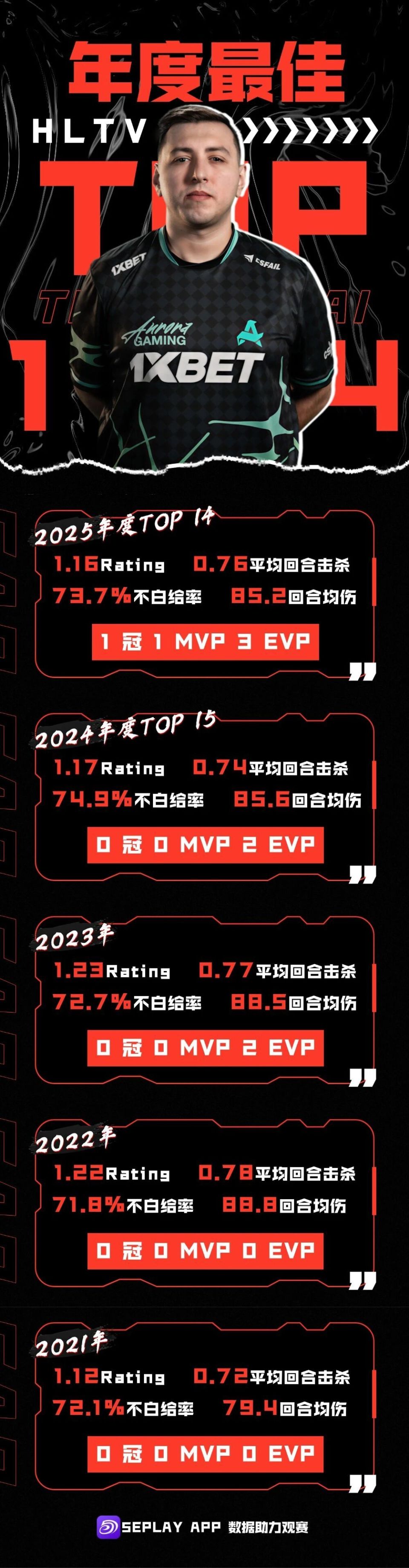 他全年保持着高度稳定的输出,仅在StarLadder布达佩斯Major中未达到“有价值选手”标准,其余赛事均至少贡献了重要价值,并累积了大量高光表现,因此荣获四项个人荣誉:PGL布加勒斯特大师赛MVP,以及BLAST赏金赛S1、顶级赛事IEM卡托维兹站和电竞世界杯的EVP。此外,他还有六次赛事表现无限接近获奖。