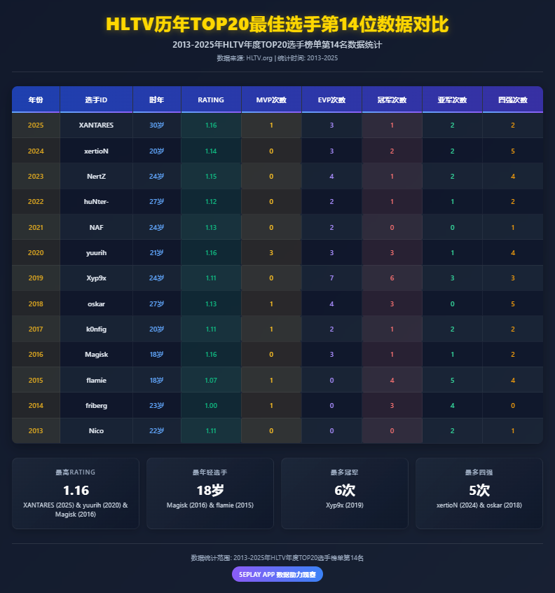 继去年XANTARES获得2024年度最佳选手TOP15后,今年他又在这个榜单中让自己的排名提升了一位。同时XANTARES还是首位以30岁年龄闯入HLTV年度TOP20榜单的选手。那么,从2013年至今,历史上每年TOP20榜单第14位的选手们数据又是如何?