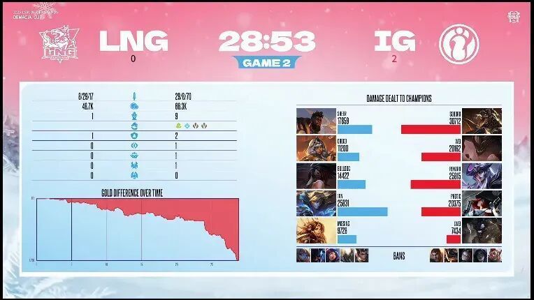 结果第二局比赛,IG没有再给LNG任何机会,28分钟内解决战斗。4分钟左右,IG下路刷先支援打出0换2;8分钟左右,IG在巢虫团打出一波1换4;17分钟左右,听牌龙团,IG打出2换3拿下小龙;20分钟左右,IG在上路打出2换3;21分钟左右,IG拿下厄塔汗;23分钟左右,龙魂团,IG打出0换5拿下龙魂;26分钟左右,IG击杀LNG上野辅随后拿下大龙;最终28分53秒,IG凭借大龙Buff,轻松推平LNG,再赢一局。