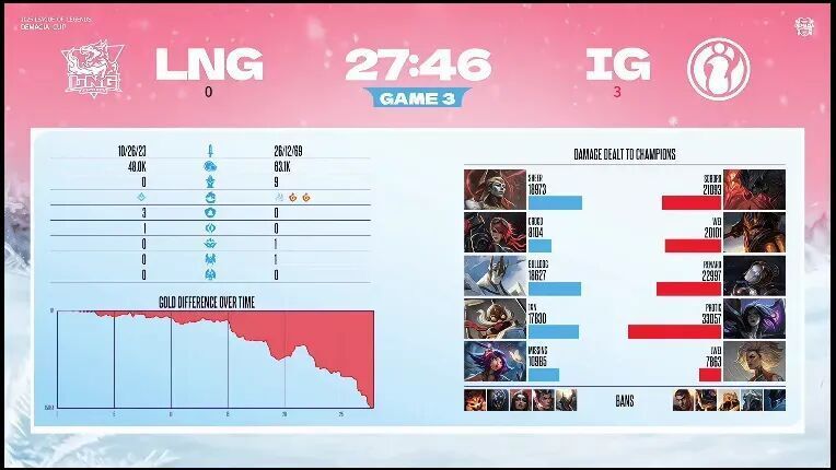 结果第三局比赛,LNG貌似放弃了治疗,抵抗27分钟后,IG赢下比赛。3分钟左右,皇子来到下路配合队友击杀飞机;6分钟左右,IG在下路河道打出1换1;7分钟左右,飞机在下路阵亡;9分钟左右,蔚判断失误被剑魔反杀;15分钟左右,蔚抢下小龙,后续IG开团打出2换5;18分钟左右,IG在野区打出0换3;20分钟左右,IG拿下厄塔汗,后续被LNG找到机会打出3换4;22分钟左右,IG中路打出0换3,LNG彻底溃败;25分钟左右,IG在野区击杀亚恒,转头拿下火龙;26分钟左右,蔚在野区阵亡,IG拿下大龙;最终27分46秒,LNG想要反打,但被打出2换5,IG凭借大龙Buff,赢下比赛。