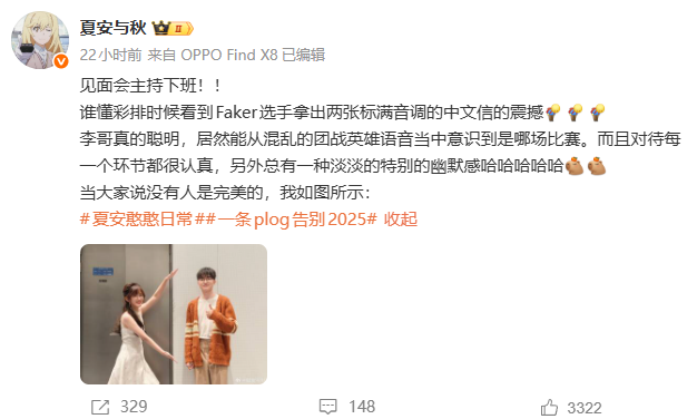 昨天Faker在成都的粉丝见面会上,掏出两封信,开始一封,结束一封,用中文念给粉丝听。(cr.抖音 Faker的企鹅公主)开始:“大家好我是Faker,很高兴再次回到成都,成都对我来说不仅是留下了夺冠回忆的奇迹之地,也是我最喜欢的火锅之乡,今天的我能够近距离看到你们,我感受到了比任何时候都温暖的力量。谢谢你们在这个对我意义非凡的地方迎接我。正如成都这座城市的魅力一样,希望今天我们能一起度过难忘的美好时光。”结束:“不知不觉到了离别的时间,能在12月31号这一天和大家一起告别过去是我今天最珍贵的收获,只要想的有你们我就无所畏惧,我会继续努力成为让你们骄傲的faker,祝大家新年快乐万事如意,希望明年也能在这个位置见到大家的笑脸,谢谢大家。”虽然Faker是在信上标注了读音,中文说的也不好,但粉丝还是很惊喜,感受到了Faker的真心和诚意。见面会主持人夏安感慨:谁懂彩排时候看到Faker选手拿出两张标满音调的中文信的震撼。