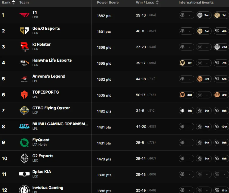 拳头对战队重新排名,BLG德杯垫底淘汰,排名断崖式下跌,拳头公布的2025年全球战力排行榜,其实并不只是一个“名次变化”的问题,而是一次非常直观的赛区实力断层展示,前四名被LCK包揽,本身就已经足够说明问题,更关键的是,这并非靠“偶然爆种”,而是贯穿全年三项国际赛事的系统性压制。