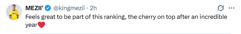 首先是mezii自己,对于首次登上HLTV年度最佳选手榜单表示高兴:“能入选这份榜单感觉太棒了,为这不可思议的一年画上了最完美的句点。”