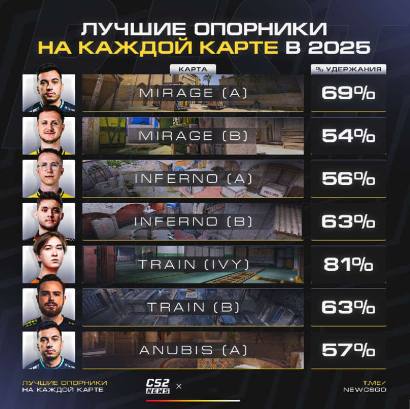 首先是Mirage的A包(Anubis目前不在服役图池中)最佳支援选手woxic,在Aurora这种战术较为薄弱的队伍中以69%的恐怖防守贡献率为队伍撑起一片天。而Mirage的B包最佳支援选手则不出意料是mezii,这位“英国GOAT”强大的防守能力被世界所认可,今年更是入围HLTV“年度最佳主点人”称号提名。