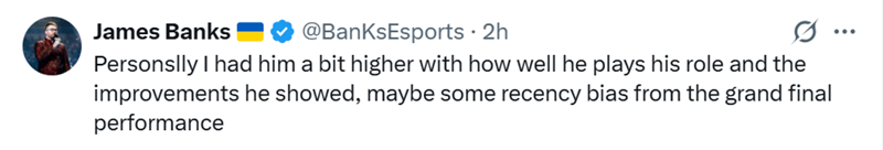 知名主持人Banks则表示低了:“就我个人而言,考虑到他在团队角色中的出色发挥以及展现出的进步,我会把他的排名再提高一些。也许总决赛的惊艳表现让我有些近因偏见了。”