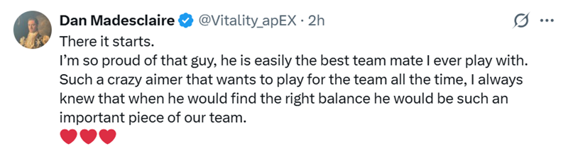 除开本人以外,最激动的当属Vitality队长apEX:“看吧,这就是他的起点。我真心为这家伙感到骄傲,他绝对是我并肩作战过的最出色的队友。他既是枪法惊人的怪物,又始终心怀团队。我一直相信,当他找到个人发挥与团队配合的最佳平衡点时,定会成为我们队伍不可或缺的基石。”
