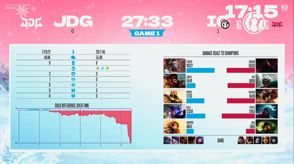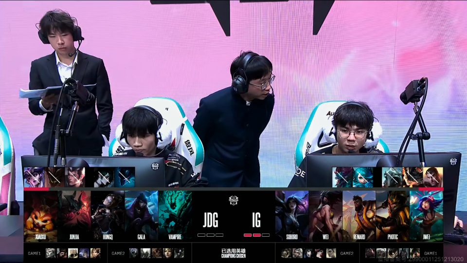 第一局比赛,JDG蓝色方,禁用:妮蔻;石头人;岩雀;辛德拉;波比,选用:Xiaoxu亚恒;Junjia猴子;HongQ沙皇;GALA芸阿娜;Vampire蕾欧娜;IG红色方,禁用:杰斯;兰博;发条;希维尔;烬,选用:Soboro塞恩;Wei狼母;Renard炸弹人;Photic韦鲁斯;Jwei泰坦