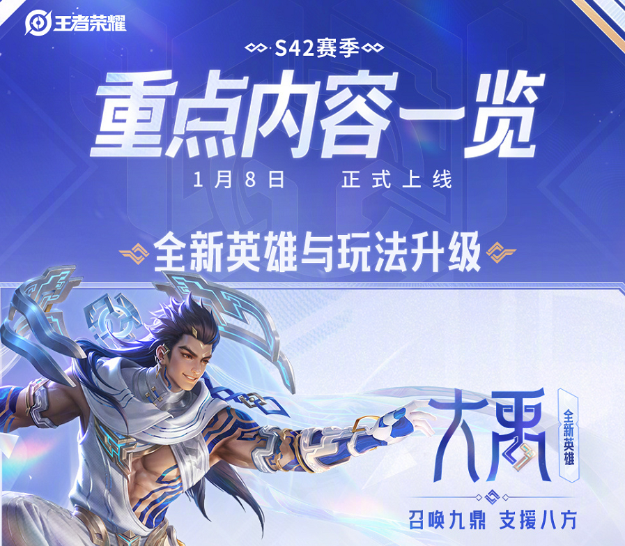 最后再来说说王者荣耀游戏内的大事情,玩家们都清楚的,让人期待的S42新赛季即将到来,1月8日,玩家们都迫不及待了,毕竟新赛季福利拉满啊。首先,暖心可靠的大哥!新英雄大禹即将上线!不知道技能会不会和水高度相关呢,三过家门而不入,会在游戏内怎样体现呢?好奇。
