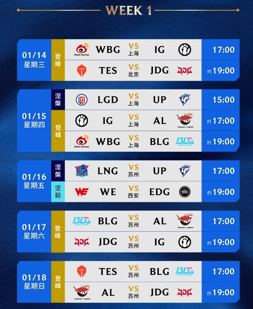 新赛季登峰组将会采用组内双循环的赛制,登峰组共有六支队伍,每支队伍要打10场BO3的比赛,IG的赛程是先打WBG,然后打AL,之后的对阵顺序是JDG,BLG和TES,打完一个完整循环之后,在1月25日的时候迎来第二个循环。