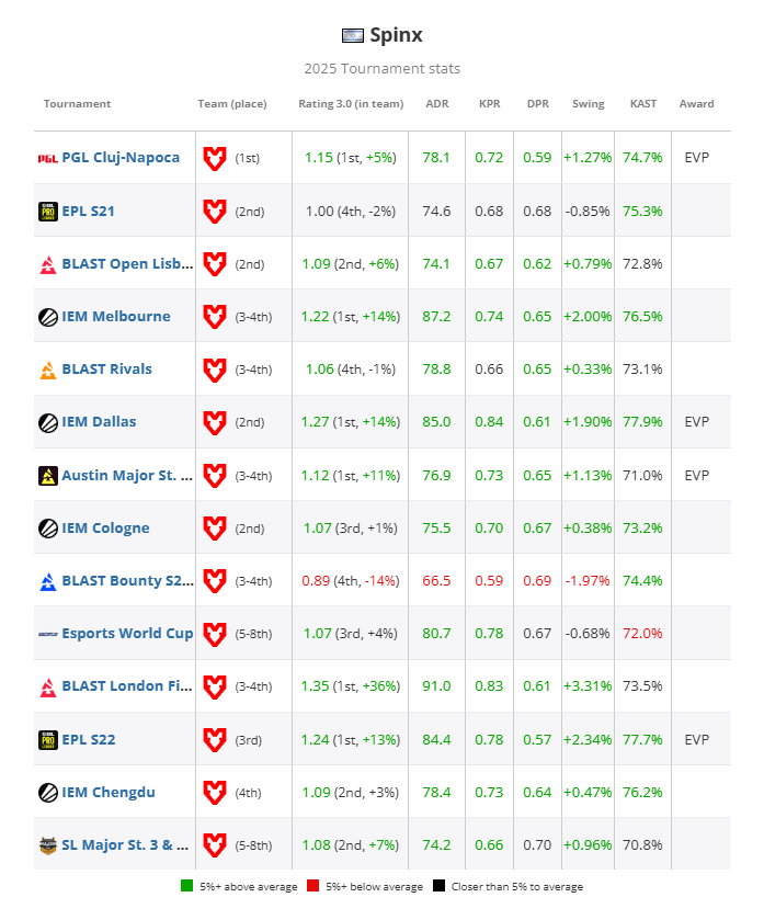Spinx在BLAST赛事中重整旗鼓,他在小组赛战胜Falcons以及淘汰赛击败Eternal Fire的比赛中发挥关键作用(两场比赛的平均rating都为1.23),并在决赛面对Vitality的前两张图中位列计分板榜首。然而这仍然不足以让他进入EVP榜单,因为他最终rating仅有1.09,且只有50%的地图数据高于平均水平。