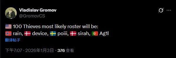 “100 Thieves的阵容大概率会是:rain、device、poiii、sirah、Ag1l”