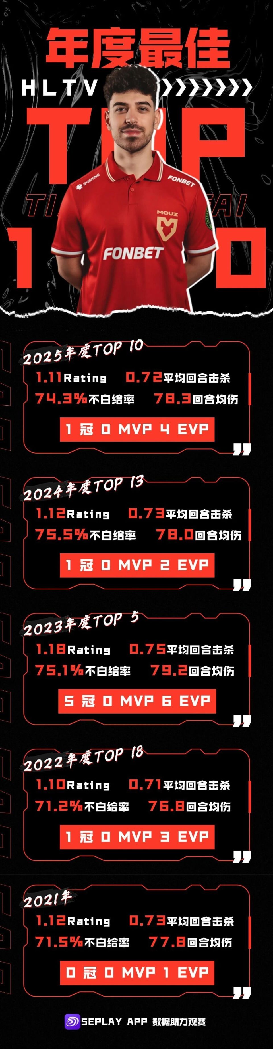 今日凌晨,HLTV正式公布了2025年度最佳选手TOP10的获得者。来自MOUZ的Spinx以1.11的Rating,4次EVP、1冠4亚、6次四强的成绩获此殊荣。