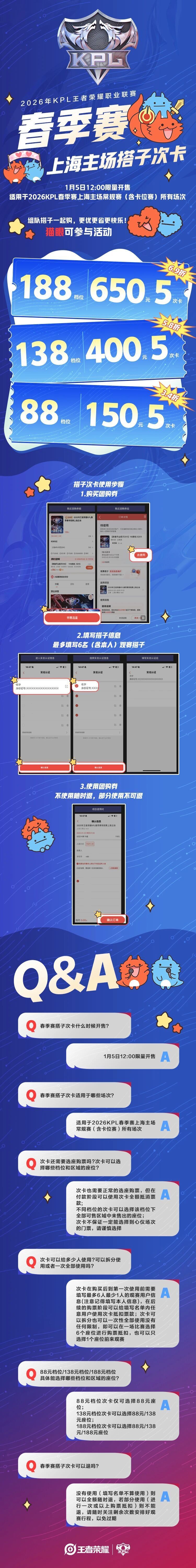 1月5日中午12:00限量开售,适用于2026年KPL春季赛上海主场常规赛(含卡位赛)所有场次。组队搭子一起购,更优更省更快乐!最低150元看5场比赛!猫眼可参与活动