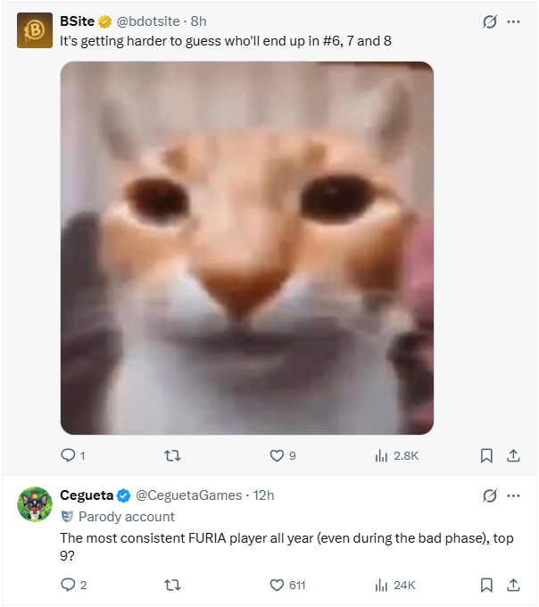 其次是分析师Mauisnake:“我个人的TOP 20榜单中,粉丝们讨论最多的点可能就是我把molodoy排在了KSCERATO前面。不过现在看来,任何花了时间认真做榜单的人(比如HLTV、launders和我自己)都一致同意(我们榜单中)排名最高的FURIA队员是谁。”
