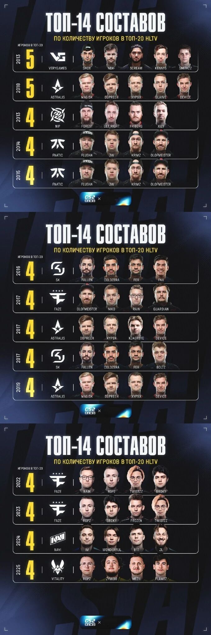 历史最高纪录仍由2018年丹麦俱乐部Astralis与2013年法国俱乐部VeryGames保持,这两支队伍当年均有五名选手入选TOP20。