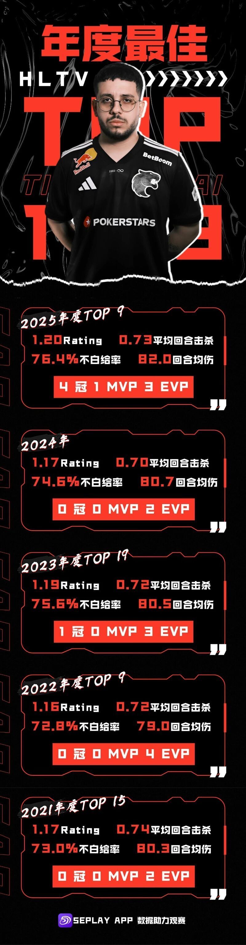 今日凌晨,HLTV正式公布了2025年度最佳选手TOP9的获得者。来自FURIA的KSCERATO以1.20的Rating,3次EVP、4个冠军1次四强的成绩获此殊荣,追平其在2022年创下的HLTV年度TOP20选手榜单第9名峰值纪录。