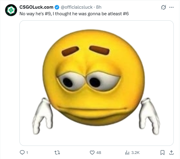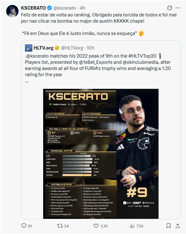 首先是KSCERATO本人,他转发了HLTV的推特,并发表了自己的看法:“很高兴能重回排行榜。感谢所有人的支持,也抱歉在奥斯汀Major上没拆掉那个包,哈哈哈我真是晕了。